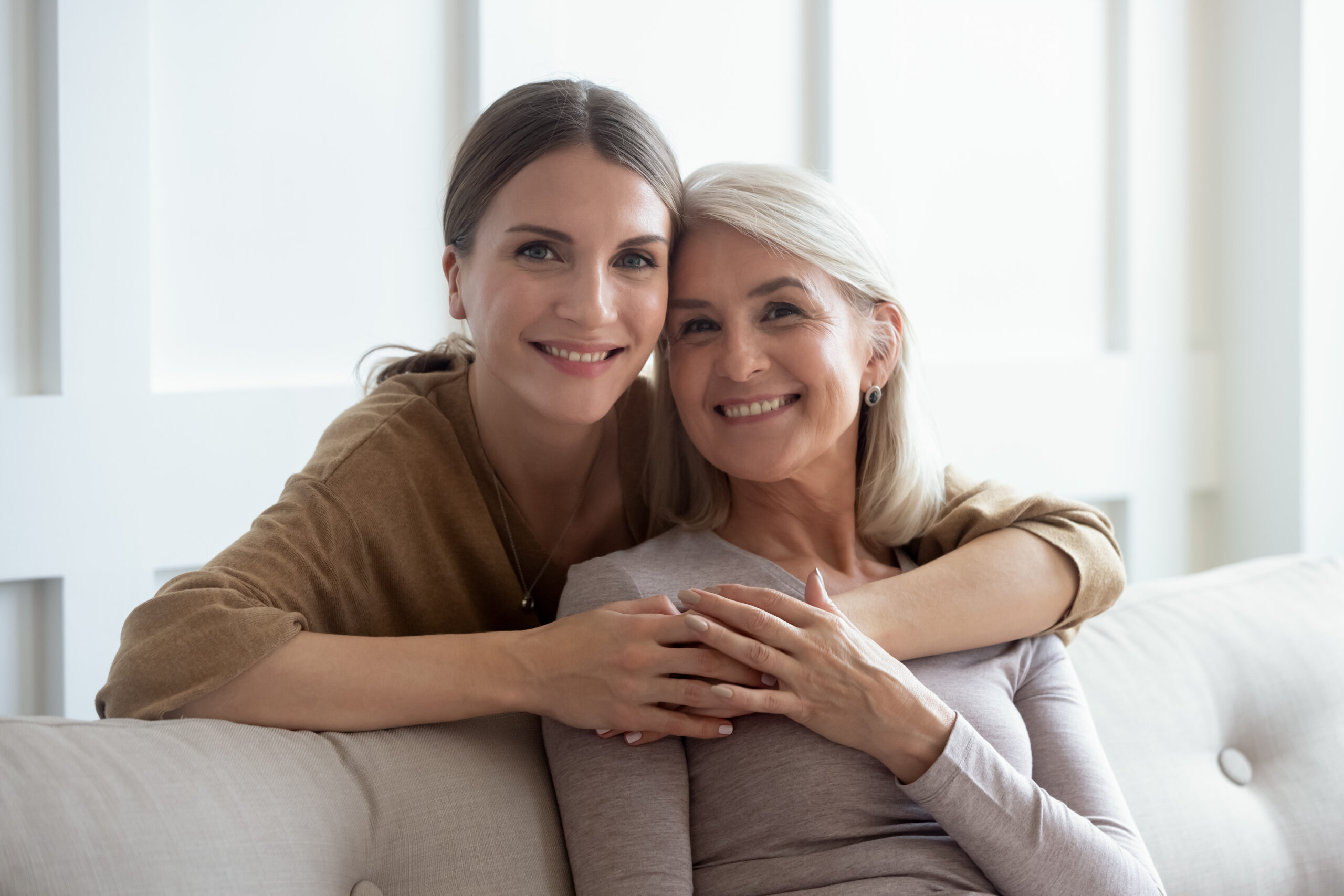 Mutter und Tochter umarmen sich und lächeln